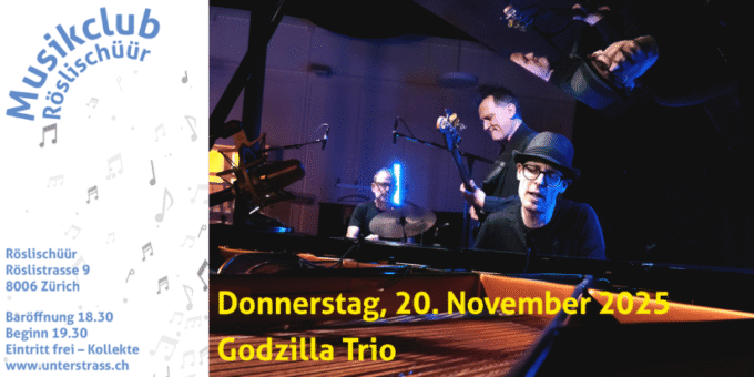 Donnerstag, 20. November 2025 ab 18.30 Uhr Godzilla Trio – Musikclub Röslischüür Die drei Zürcher Musiker verschreiben sich ganz der Neuinterpretation bekannter Standards, für ein...