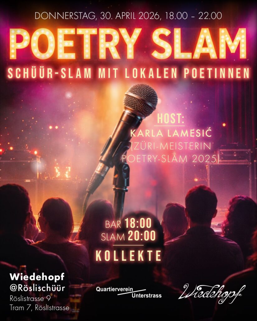 Wortakrobatik – wenn Karla Lamesić, Zürich-Meisterin Poetry Slam 2025, die Bühne betritt, wird Sprache lebendig. Am Quartier-Slam in der Röslischüür trifft sie auf weitere wortgewandte Slamer*innen die mit Humor, Tiefgang und scharfsinnigen Pointen um die Gunst des Publikums spielen.
